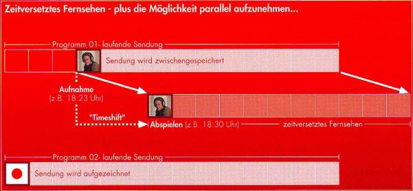 Mit der eingebauten Festplatte machen sich Fernsehen und Videorecording mittels "time slip" oder "time shift", d.h. durch zeitversetztes Sehen, von der Sendezeit der TV-Stationen unabhängig. So integriert Metz (www.metz.de) einen TV-Recorder mit Festplatte direkt in den Fernseher und kann diesen mit der TV-Fernbedienung steuern. Mehrere Metz-Geräte sind dafür geeignet. Panasonic (www.panasonic.de) bietet ab Dezember 2003 den High End Satellitenreciever TU-HMS3 und den DVD Videorecorder DMR-E100 mit integrierter Festplatte an, d.h. mit time slip-Funktion. Anstelle einer Videobandkassette tritt für die Fernsehaufzeichnung die Festplatte.